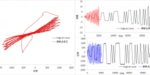 实干、实践、积累、思考、创新。 采用DataSmoothing软件( [工具][试验][软件] DataSmoothing v2024: A Program for Test Data Smoothing [试验数据曲线平滑+降噪工具 2024版] )对一组试验曲线进行修正,做一个软件应用案例。 原始试验滞回曲线如下图所示,存在很多异常点及停顿点。 导入DataSmoothing进行停顿点修正 修正后如下图,停顿点得到了修正,曲线数据点显著减少。 进一步删除特殊离散点 并 进行平滑修正。 修正前后曲线效果如下 相关博文( Related Topics) [01] [试验][软件][科研] CurveCorrection 2024: General Curve Correction …
