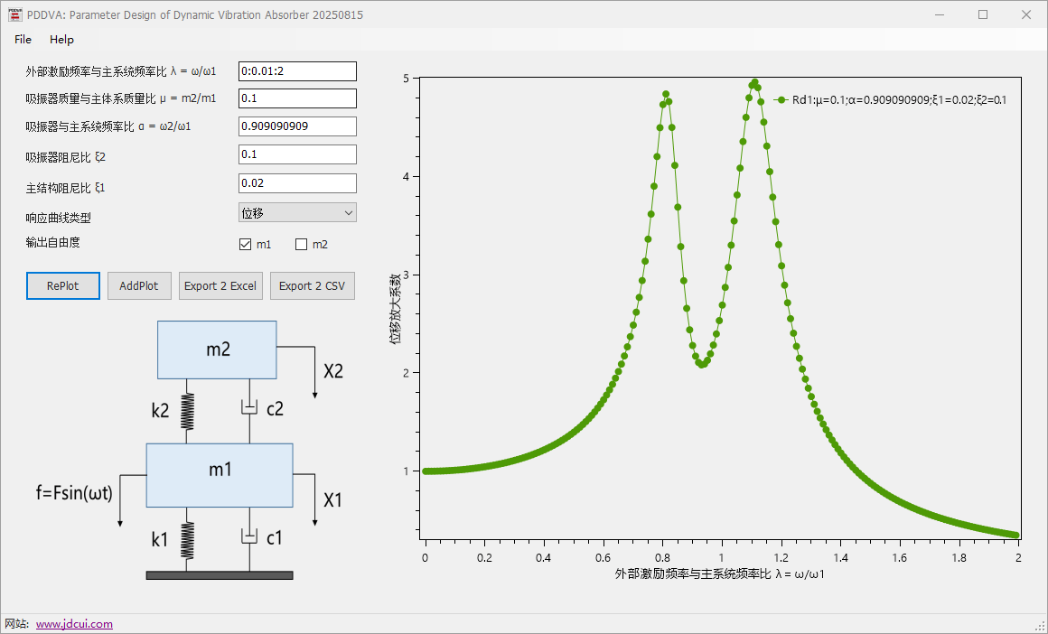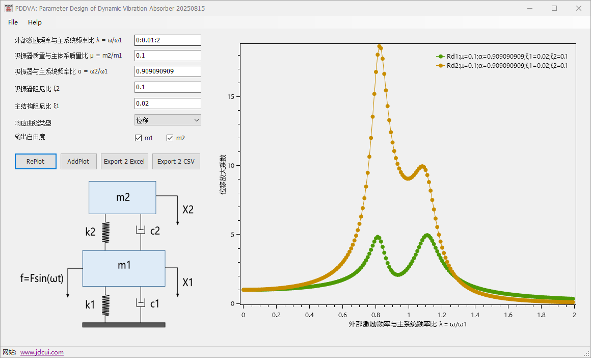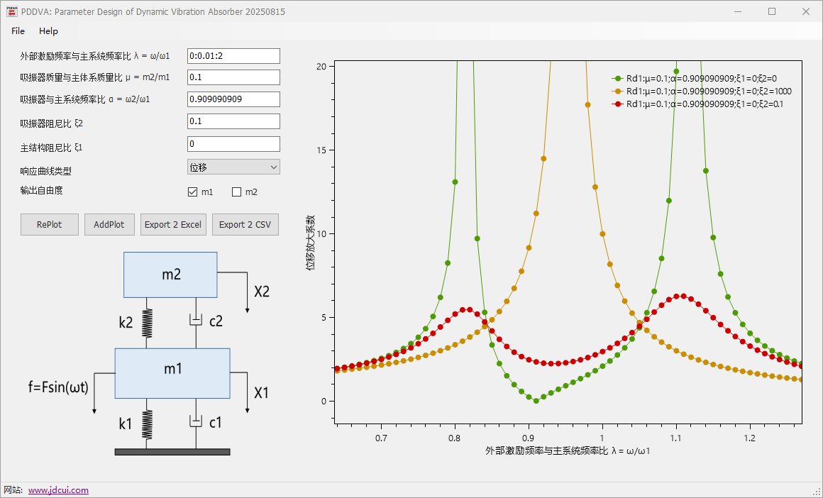 这是一款在学习振动控制过程中开发的动力吸振器参数分析工具。目前主要集成了经典的二自由度系统模型(即调谐质量阻尼器TMD模型)。用户可通过该程序调整多种参数,生成频响曲线图,并将结果导出至Excel,从而辅助经典振动理论的学习与研究。未来计划扩展更多类型的吸振器模型,并逐步加入参数敏感性分析等功能。