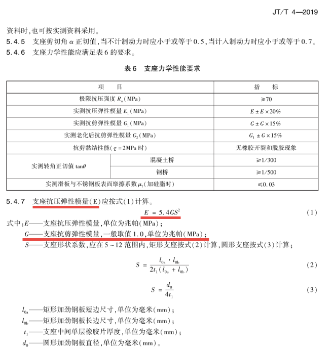 (2)橡胶支座的抗压弹性模量E与抗剪弹性模量G及支座形状系数S相关。