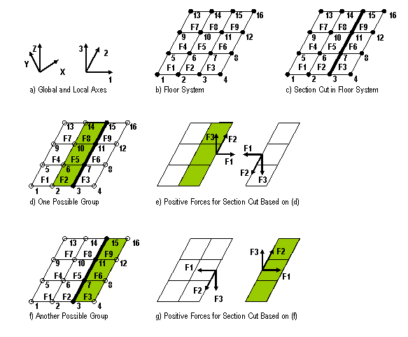 Figure b shows a floor system that consists of 9 area objects labeled F1 through F9 and 16 associated point objects labeled 1 through 16. Suppose that we want to determine the section cut forces through the floor system at the location identified by the heavy line in Figure c. This section cut passes through the point objects labeled 3, 7, 11 and 15.