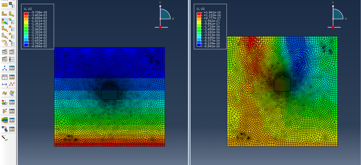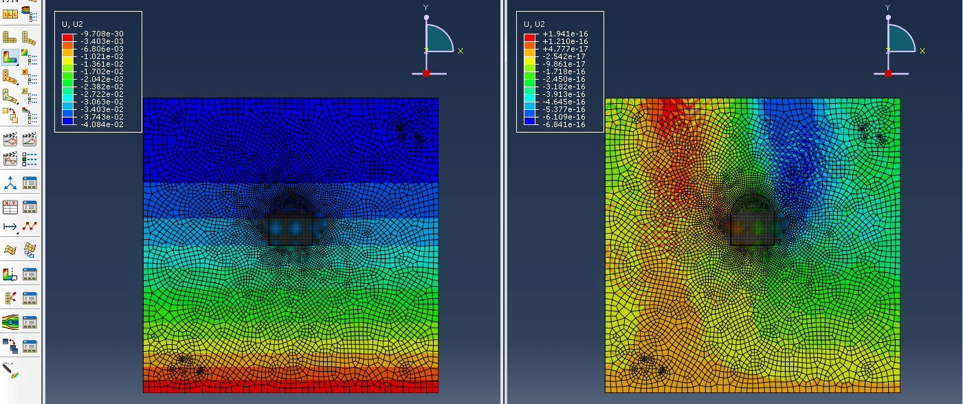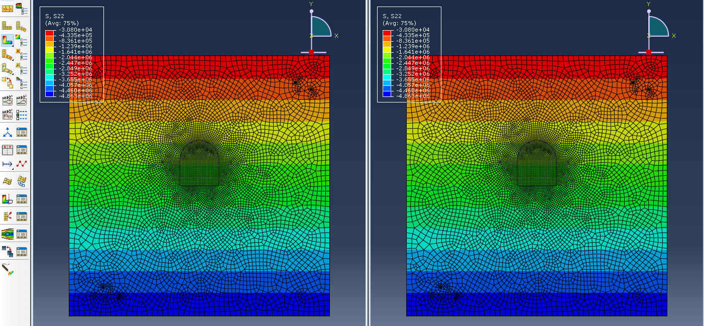 下图是一个ABAQUS测试的小例子,左边是直接对模型进行重力荷载,右边是进行地应力平衡的结果。