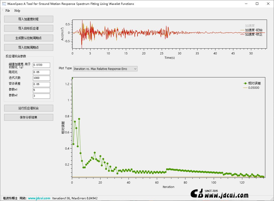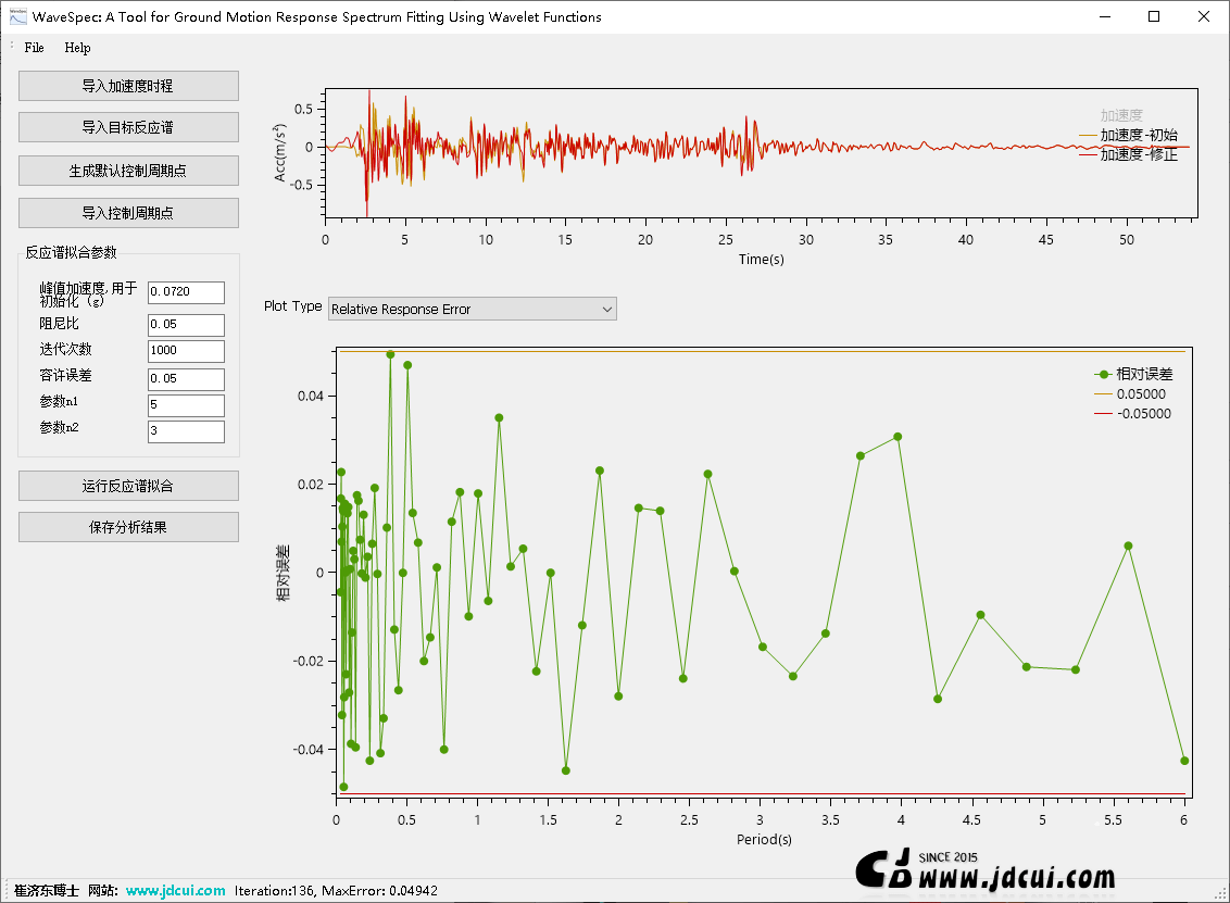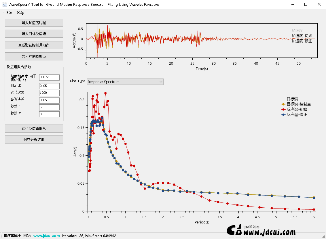 WaveSpec: A Tool for Ground Motion Response Spectrum Fitting Using Wavelet Functions,是一款地震工程分析软件,用于将给定的地震动加速度时程调整至其反应谱与目标设计谱相匹配。程序基于张郁山与赵凤新于2014年发表于《土木工程学报》的论文《基于小波函数的地震动反应谱拟合方法》中提出的算法实现,旨在为结构抗震设计、地震动合成与场地反应分析提供高精度、高效率的谱拟合工具。该方法的核心在于构造一种增量位移小波函数,通过两次微分得到增量加速度小波函数,并将其叠加至初始加速度时程中,进而对反应谱进行拟合。