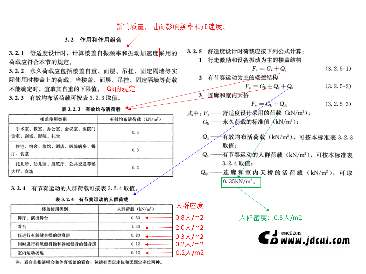 第3.2节规定的荷载用于计算楼盖的自振频率和振动加速度,即所选荷载将影响结构质量。