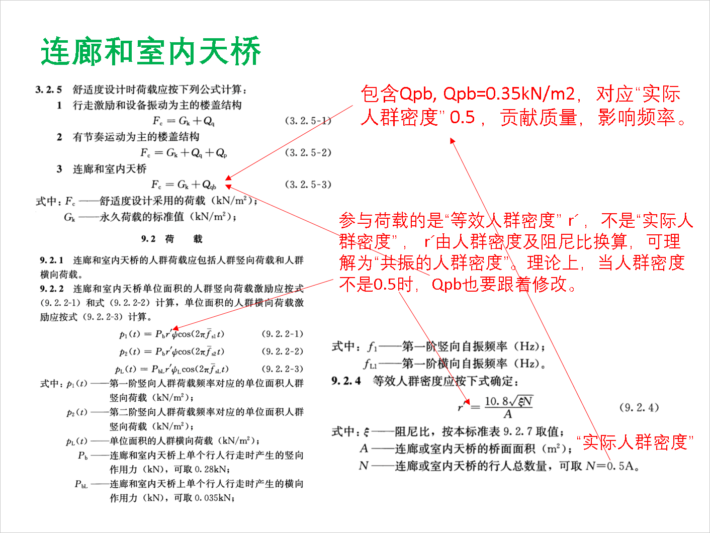 | 连廊/天桥荷载 Qqb | 是 | 否(激励另按 r′计算) | 固定取0.35 kN/m²,对应密度0.5人/m²。理论上应按实际人群密度取值。 |