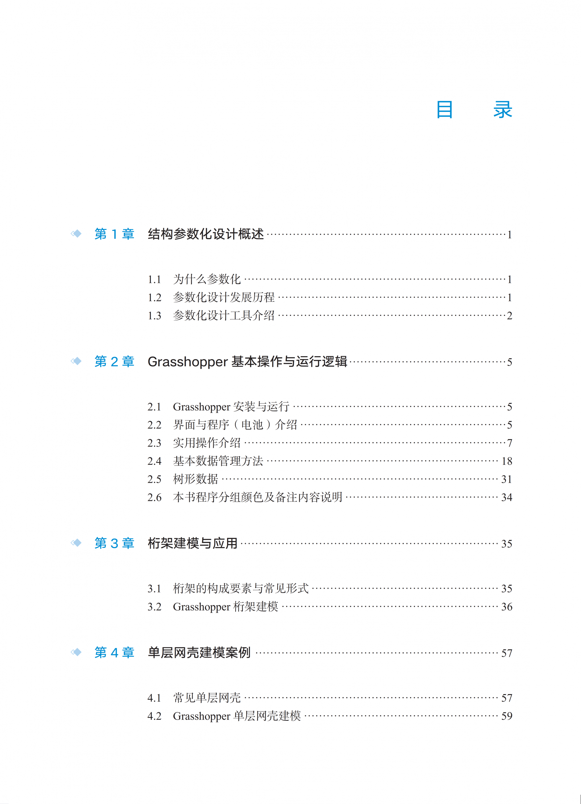 全书内容由浅入深,从参数化设计的基本概念与Grasshopper核心原理入手,逐步引导读者掌握数据流驱动的算法构建方法。书中通过一系列从工程实践中提炼和抽象出的教学案例,重点解析不同结构体系的参数化逻辑与模型搭建流程,帮助读者将参数化思维转化为稳定、高效且可扩展的建模能力。