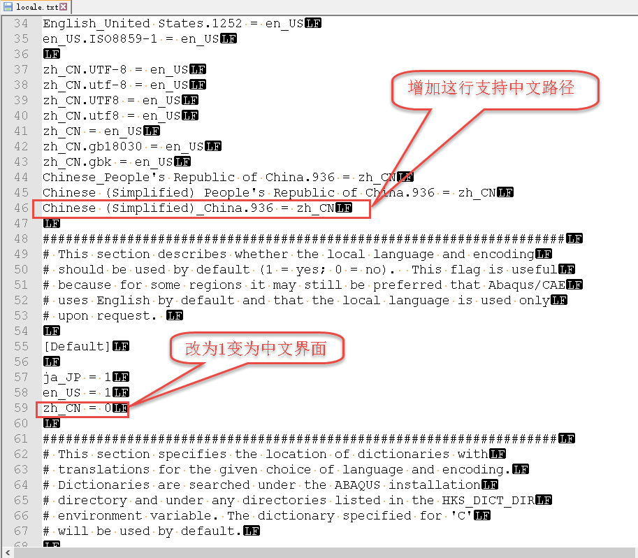 可以在ABAQUS的安装目录下找到locale.txt文件,并在locale.txt文件中设置相关参数,让ABQSUS支持中文路径,具体如下图所示:
